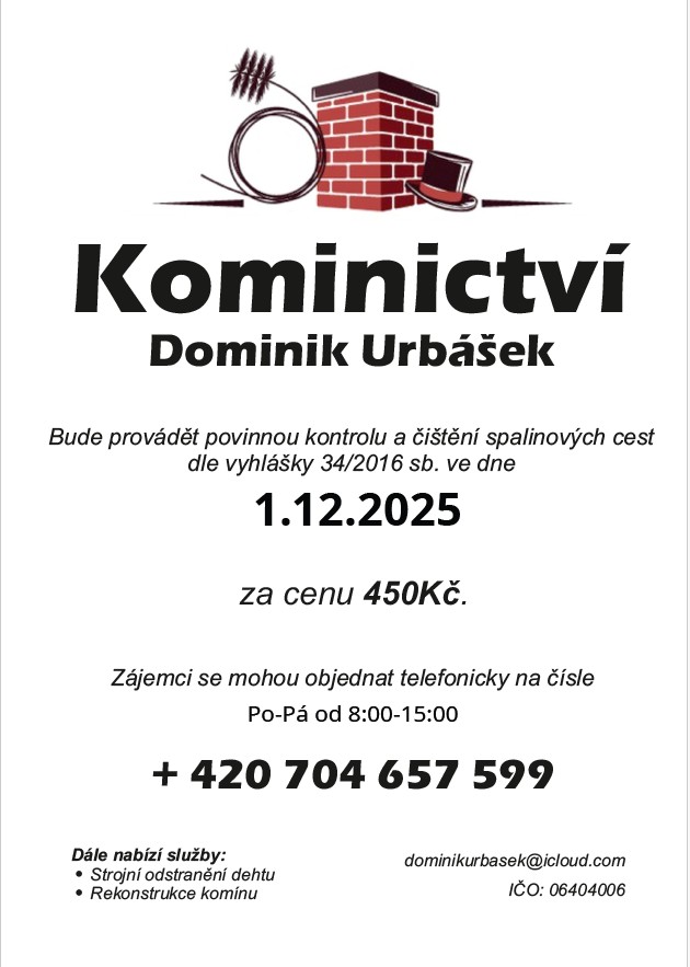 Kominictví Urbášek bude v naší obci dne 1.12.2025 provádět povinnou, každoroční kontrolu a čištění komínů a spalinových cest, od spotřebičů na pevná a plynná paliva.