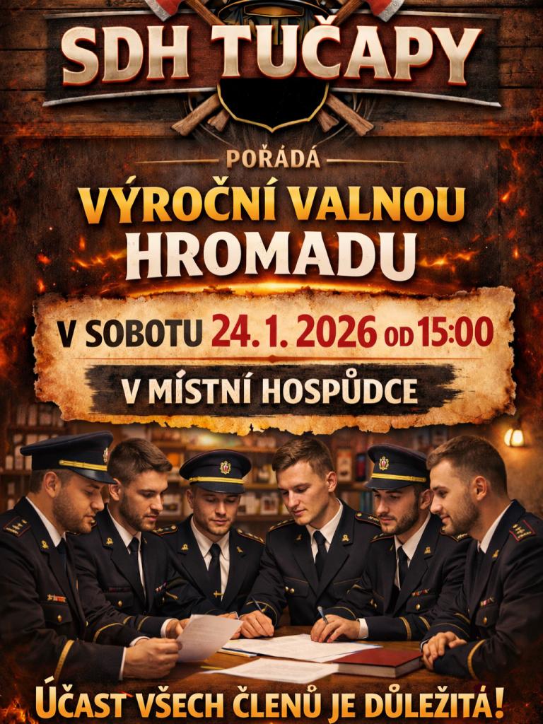bor dobrovolných hasičů Tučapy pořádá výroční valnou hromadu, která se uskuteční v sobotu 24. ledna 2026 od 15 hodin v místní hospůdce. Žádáme všechny členy SDH Tučapy o účast, která je velmi důležitá.